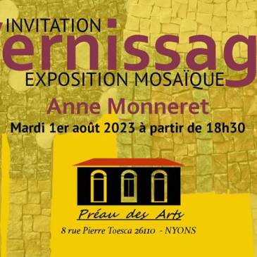 Première exposition du mois d’août, et sixième de la Saison Estivale 2023. Anne MONNERET présente ses mosaïques du 1er AOÛT au 6 AOÛT Son vernissage aura lieu le Mardi 1er Aoûtà … Lire la suite Anne Monneret